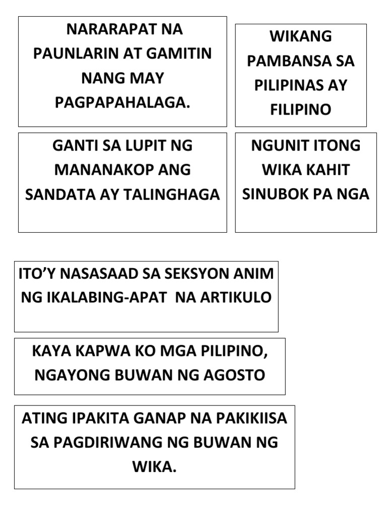 Buwan ng wikang pambansa. W-ikang Filipino ang wikang pambansa i-pagmamalaki at gagamitin parati k-asaysayan ang siyang magpapatunay a-t naging sandigan ng kulturang pinagmulan Para sa impormasyon brainlyphquestion1708575. IMBAY SALIW-AWIT Props 10 Kasuotan 20 Sabay sabay.