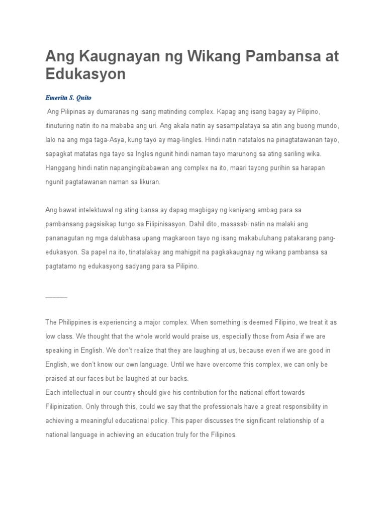 Ang Kaugnayan ng Wikang Pambansa at Edukasyon Dumadanas ng matinding Complex Itinuturin na mababang uri ang mga bagay na Pilipino. Quezon ang tinaguriang Ama ng Wikang Pambansa. Quito pilipinas dumadanas ng matinding complex itinuturing na ma babang uri ang mga bagay na pilipino matataas ang mga pilipino sa ingles ngunit hindi sa sariling wika latin ginamit na intelektwal na wika sa europa.