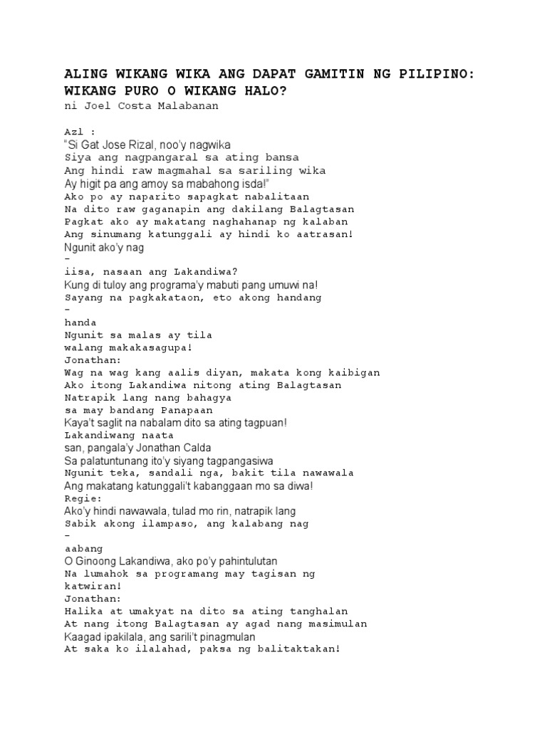 Balagtasan tungkol sa wikang filipino. Wikang Pambansa Wikang Panlahat. Script para sa balagtasan na tungkol sa frat.
